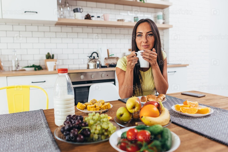 Молодая женщина пьет кофе на кухне по утрам, глядя в камеру