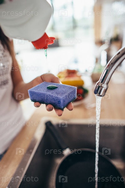 Женщина наносит моющее средство на губку. Мытье посуды вручную
