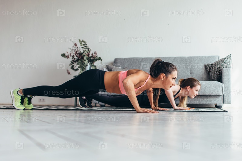 Две фитнес-женщины делают отжимания, тренируются дома. Вид сбоку
