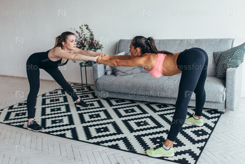 Стрейч-фитнес-женщины вместе делают упражнения на растяжку. Сгибание ног и спины в положении стоя
