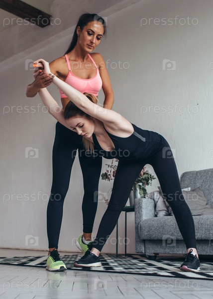 Молодая женщина тренируется со своим тренером по фитнесу. Тренируем растяжку спины