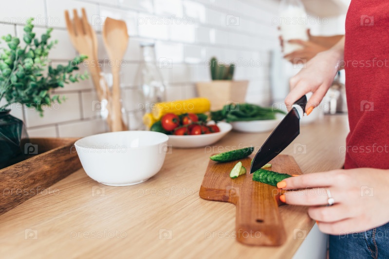 Женщина режет огурец на деревянной доске