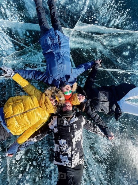 Группа счастливых друзей-туристов на фоне ледяного зимнего озера Байкал в солнечный день. Зимнее озеро Байкал, Россия. Концепция свободы, путешествия и счастья