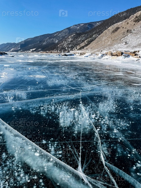 Текстура красивого голубого льда с трещинами и пузырьками воздуха в замерзшем озере