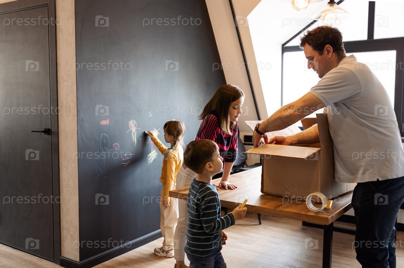 Счастливая семья играет в новый дом. Ребенок веселится вместе с отцом
