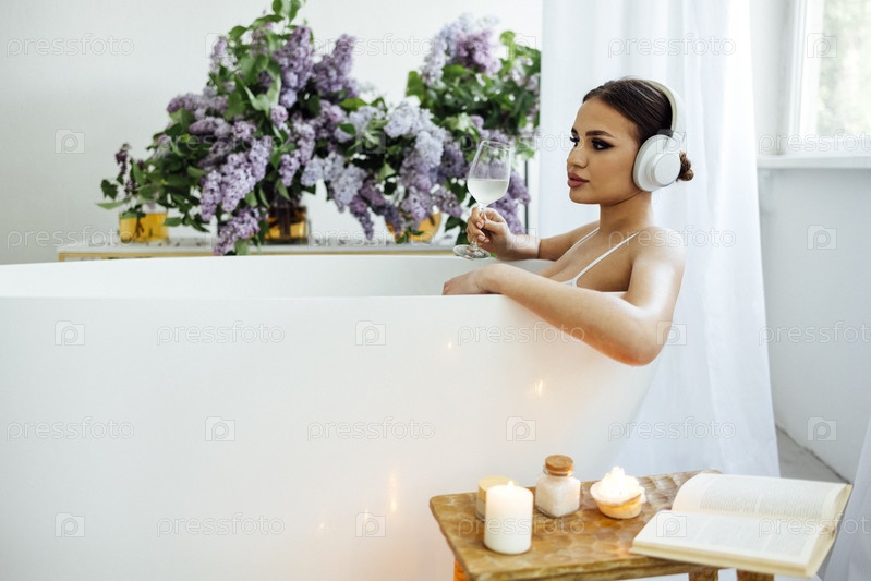 Портрет красивой женщины в наушниках во время принятия ванны дома