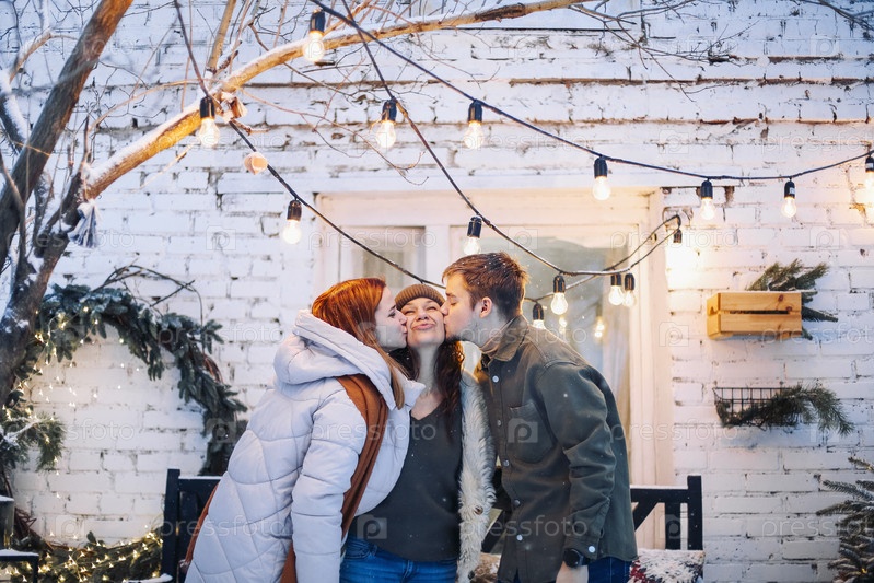 Старшие дети целуют счастливую мать, стоя у дома, украшенного к новогодним праздникам
