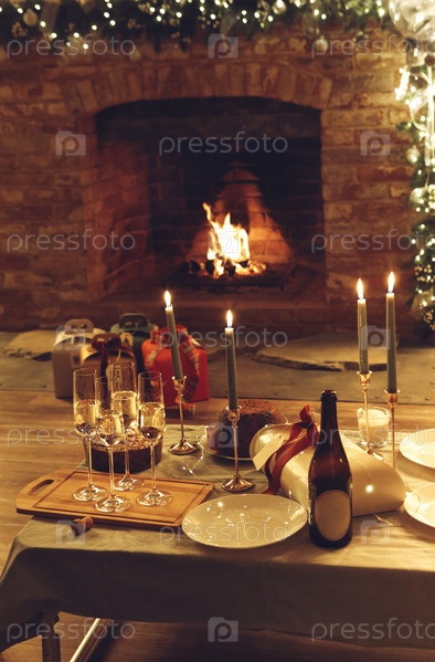 Праздничный стол с рождественским или новогодним ужином у камина и рождественскими подарками в уютном теплом доме