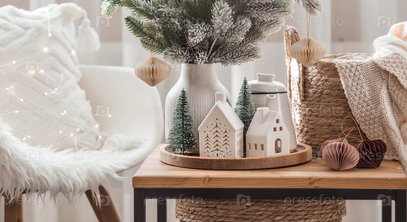 Букет елей, плед в плетеной корзине и скандинавские белые домики на деревянном столе в домашнем интерьере гостиной. Уютная концепция праздничного оформления дома