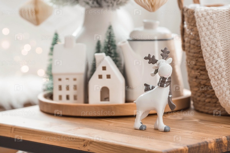 Букет елок, северный олень, одеяло в корзине и скандинавские белые домики на деревянном столе в домашнем интерьере гостиной. Уютная концепция праздничного оформления дома