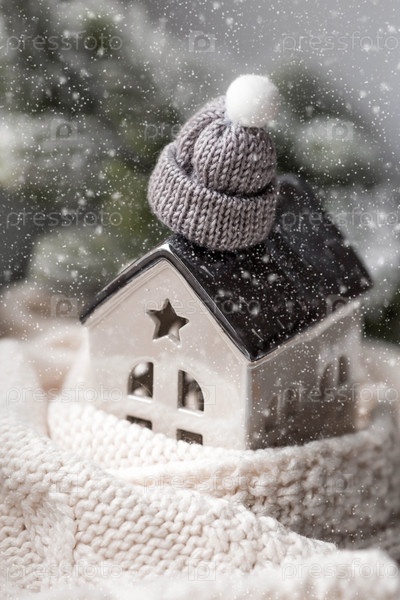 Дом, закутанный в шарф. Зима. Утепление дома, защита от холода и непогоды, система отопления помещений. Энергетический кризис в Европе. Праздничное настроение, Рождество, Новый год 2023
