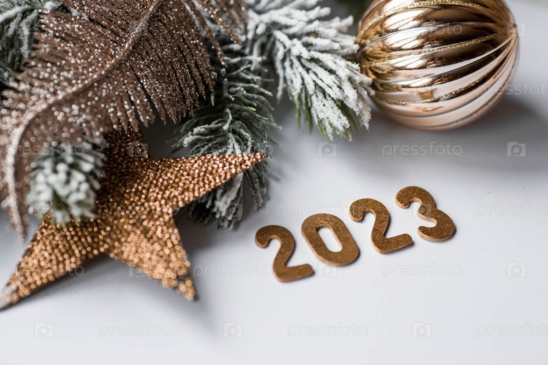 Баннер. С Новым Годом. Золотые числа 2023, еловые ветки, елочные игрушки и золотые звезды на белом фоне. Плоская планировка