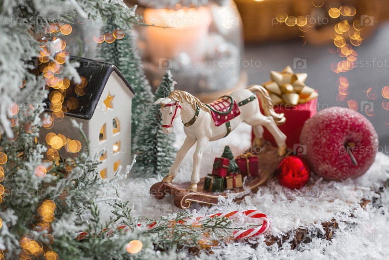 С Новым 2023 годом. Рождественская открытка, баннер с лошадкой-качалкой, елки, подарки и красивое боке на заднем плане. Концепция домашнего зимнего отдыха, тепла и уюта