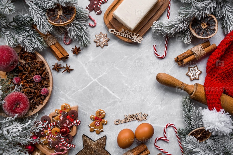 С Новым 2023 годом. Баннер с кухонной утварью, рождественскими украшениями, корицей, пряниками и елью на мраморном фоне. Поздравительная открытка на Рождество. Концепция кафе и ресторанов