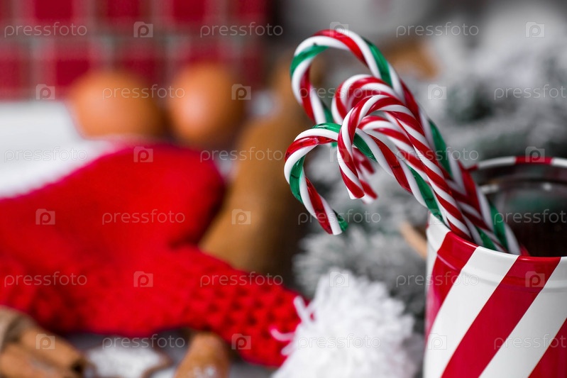 С Новым 2023 годом. Баннер. Полосатые леденцы в банке, место для копирования текста. Леденец трость. Поздравительная открытка на Рождество. Концепция магазина сладостей
