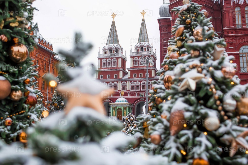 Новогоднее украшение улиц. Красивые праздничные пейзажи в городе. Украшенные елки. Новогодние зимние каникулы 2023