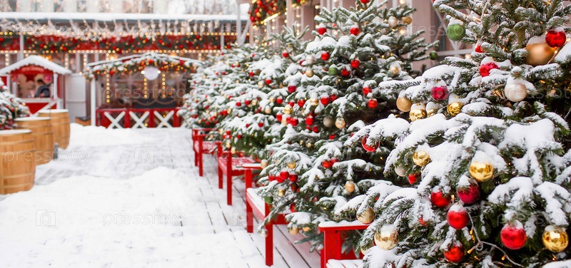 Новогоднее украшение улиц. в классических красно-зеленых тонах. Красивые праздничные пейзажи в городе Москве. Украшенные елки