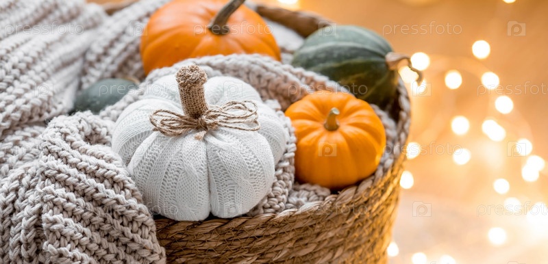 Натюрморт. Вязаная тыква, оранжевые тыквы, бежевый вязаный плед в самодельной плетеной корзине. Уютная осенняя концепция. Домашний декор