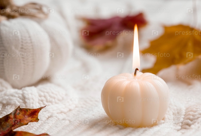 Натюрморт. Вязаная тыква, осенние листья, белый вязаный плед и горящая свеча в виде тыквы. Уютная осенняя концепция
