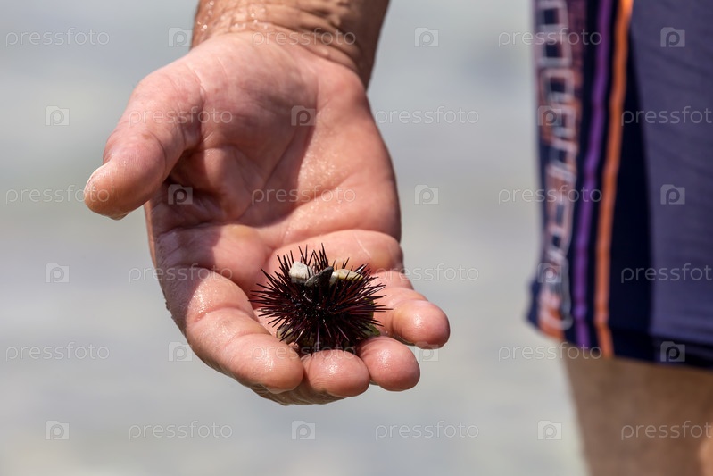 Морские ежи (Echinoidea) в мужской руке крупным планом