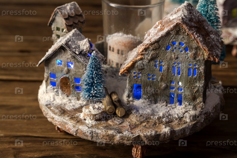 Рождественская композиция с домиками на деревянном подносе крупным планом