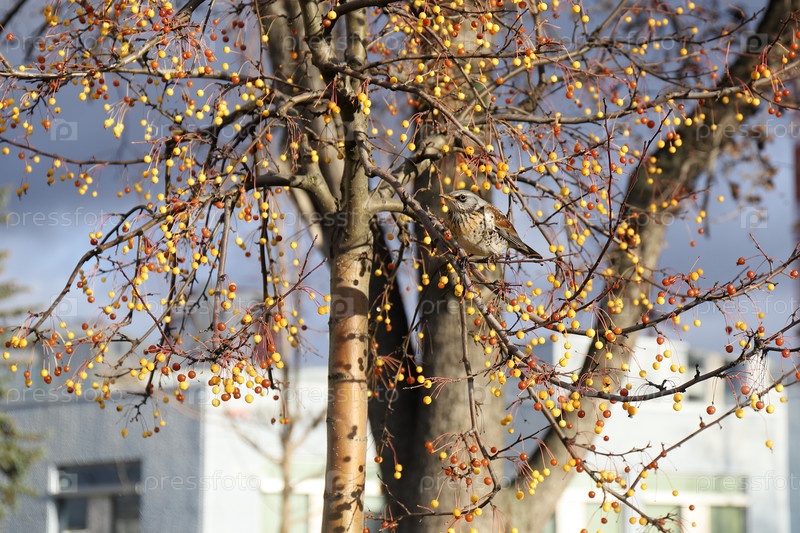Дрозд рябинник на фоне дерева с ягодами осенью