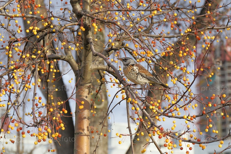 Дрозд рябинник на фоне дерева с ягодами осенью