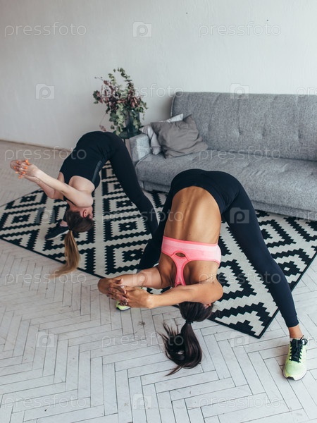 Фитнес-женщины растягивают спину дома. Молодая стройная девушка делает наклон вперед