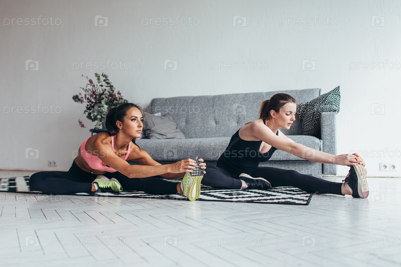 Подтянутые женщины делают растяжку, сидя дома на полу