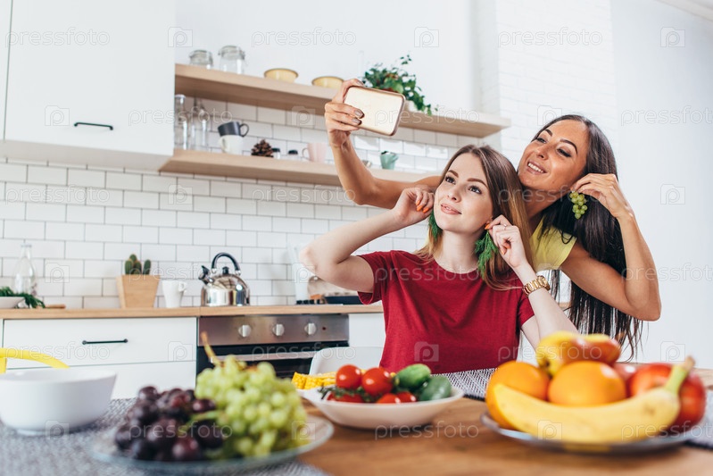 Женщины едят, играют с овощами на кухне, веселятся и делают селфи