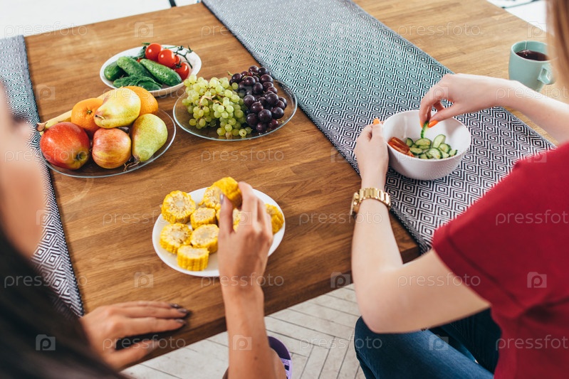 Друзья сидят за столом, разговаривают и едят овощи руками