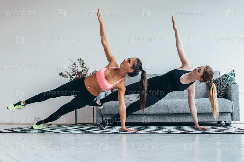 Подходящие женщины делают упражнения на боковой доске, практикуют пилатес дома