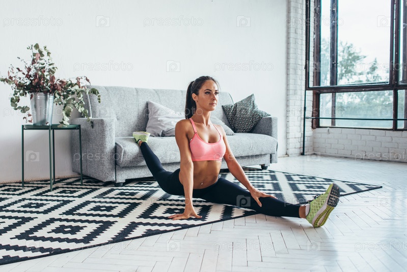 Подходящая женщина делает сплит-тренировки дома Гибкость, растяжка, фитнес
