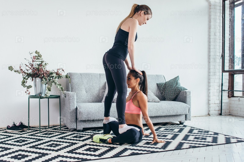 Женщина помогает другу в тренировке по растяжке ног дома