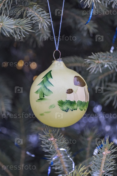 Старая новогодняя елочная игрушка шар с рисунком елки и грибов