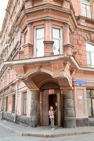 Девушка идет по улице перед домом. Выборг