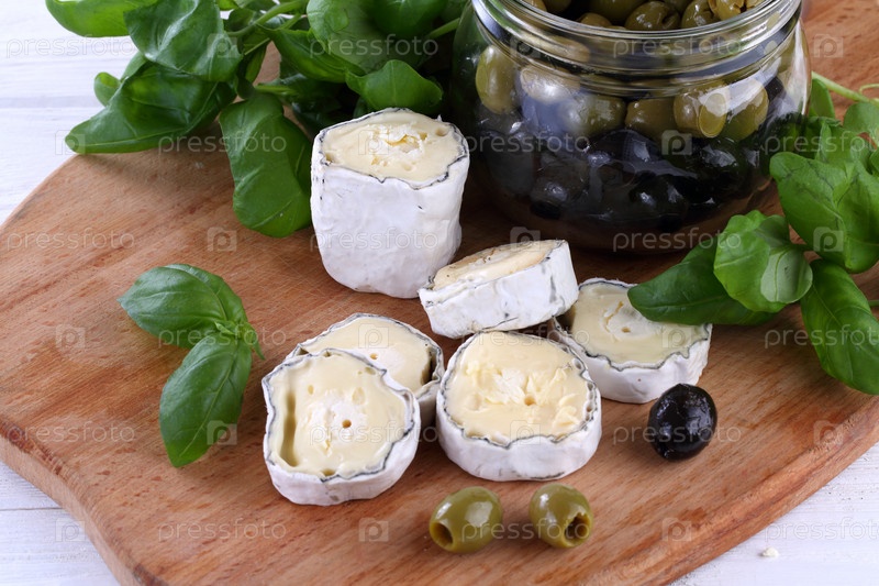 Натюрморт с сыром сент мор де турен с маслинами на белом фоне