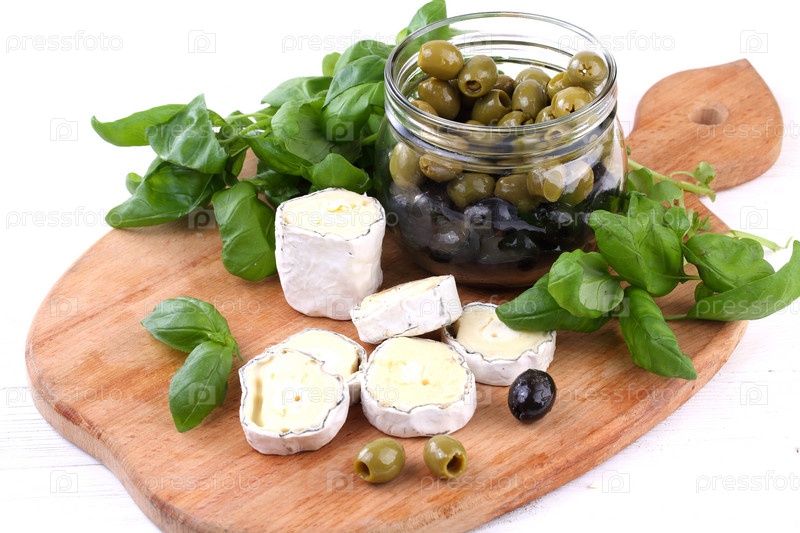 Натюрморт с сыром сент мор де турен с маслинами на белом фоне