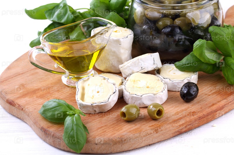 Натюрморт с сыром сент мор де турен с маслинами на белом фоне