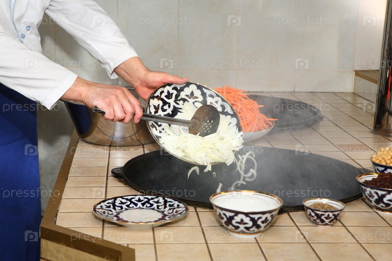 Приготовление плова на кухне восточного ресторана. Вытаскивает кусок баранины
