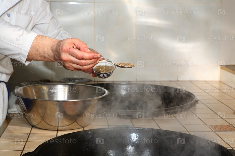 Приготовление плова на кухне восточного ресторана. Вытаскивает кусок баранины
