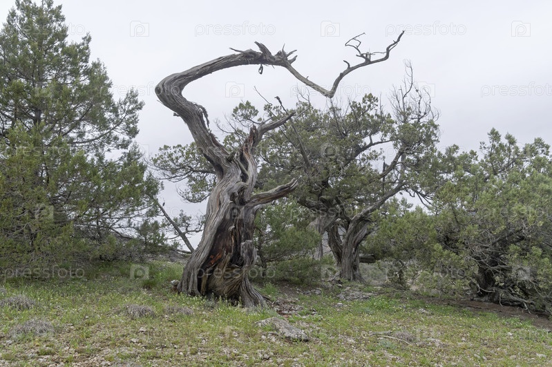 Умерший реликтовый деревянный можжевельник (Juniperus excelsa) с причудливо изогнутым стволом. Крым. Судак, гора Сокол