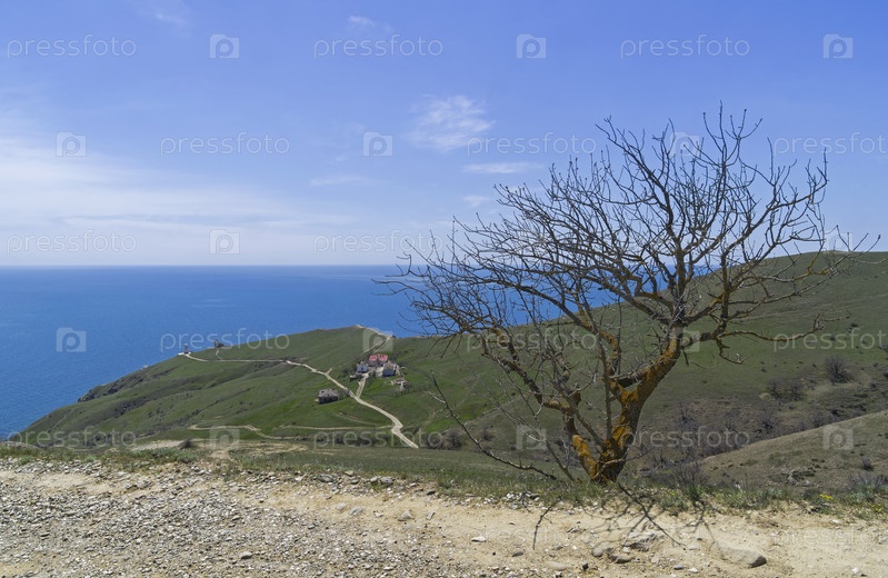 Панорама мыса Меганом - вид на склон, спускающийся к маяку. Крым, солнечный день в апреле