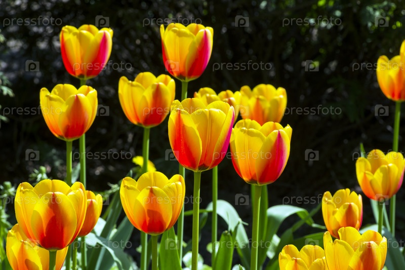 Красивые красно-желтые тюльпаны на клумбе. Солнечный день в мае. Аптекарский Огород (филиал ботанического сада МГУ), Москва