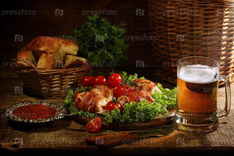 Пиво с жареными куриными рулетиками на деревянном столе