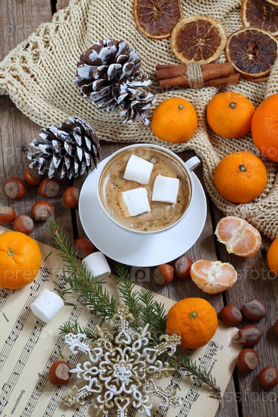 Рождественский натюрморт с кофе капучино с зефиром и мандаринами