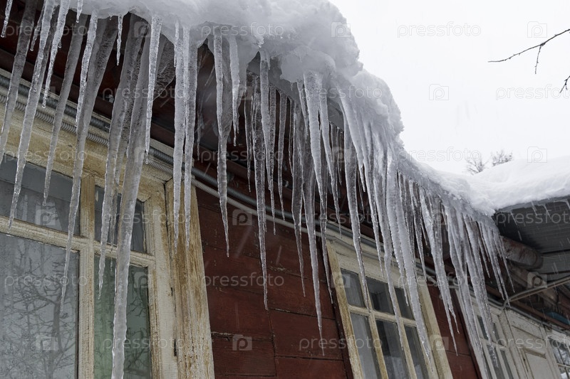 Большие сосульки на крыше сельского дома