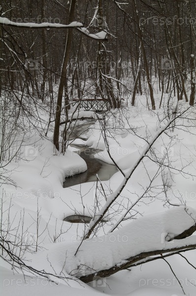 Незамерзающий ручей в зимнем лесу. Конец февраля. Битцевский лес, Москва. Верховья реки Чертановка