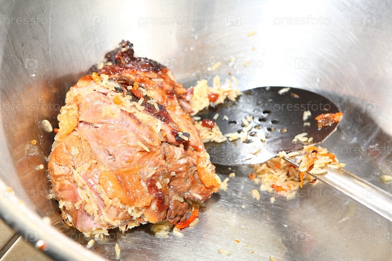 Приготовление плова на кухне восточного ресторана. Вытаскивает кусок баранины