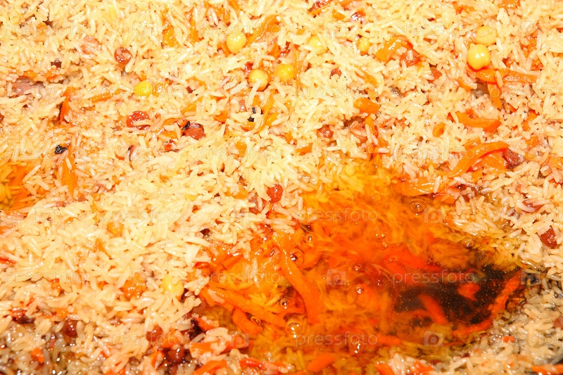 Приготовление плова на кухне восточного ресторана. Вытаскивает кусок баранины